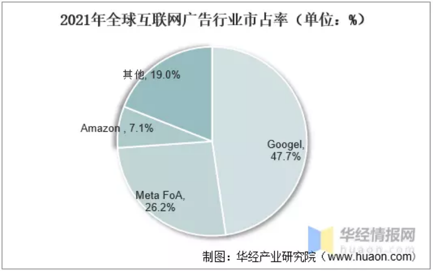 據(jù)統(tǒng)計(jì),根據(jù)華經(jīng)產(chǎn)業(yè)研究院的數(shù)據(jù)統(tǒng)計(jì),在2021年全球互聯(lián)網(wǎng)廣告行業(yè)市占率的數(shù)據(jù)中,谷歌以47%的數(shù)據(jù)占據(jù)行業(yè)第一,緊隨其后的是社交廣告巨頭Meta以26%的市場(chǎng)占有率位居第二。