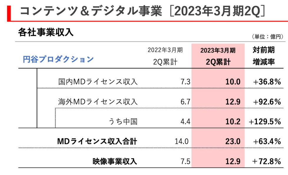 然而,就在近日圓谷最新披露出的財(cái)務(wù)報(bào)告中,中國市場成為了這次報(bào)告中最大的一個(gè)驚喜——其業(yè)績被圓谷制作公司單獨(dú)作為一項(xiàng)列出:2021年4月至9月,圓谷在中國市場的收入為4.47億日元,而2022年4月至9月,圓谷在中國市場的收入累計(jì)達(dá)到了10.26億日元,實(shí)現(xiàn)了同比129.5%的猛增長。