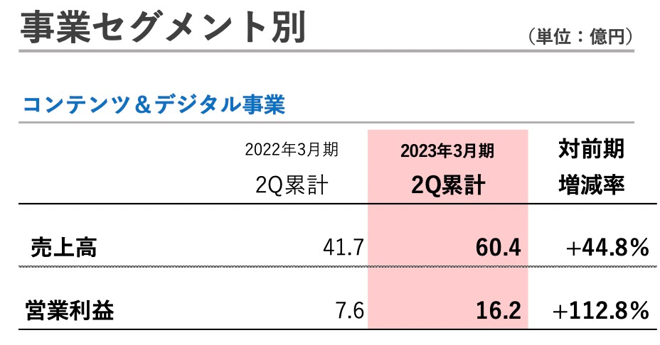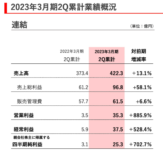 綜合看來,該業(yè)務(wù)板塊在2022年二三季度的業(yè)績增長情況為:銷售額達(dá)到60.46億日元,環(huán)比增長44.8%;營業(yè)利潤達(dá)到16.23億日元,同比增長112.8%。