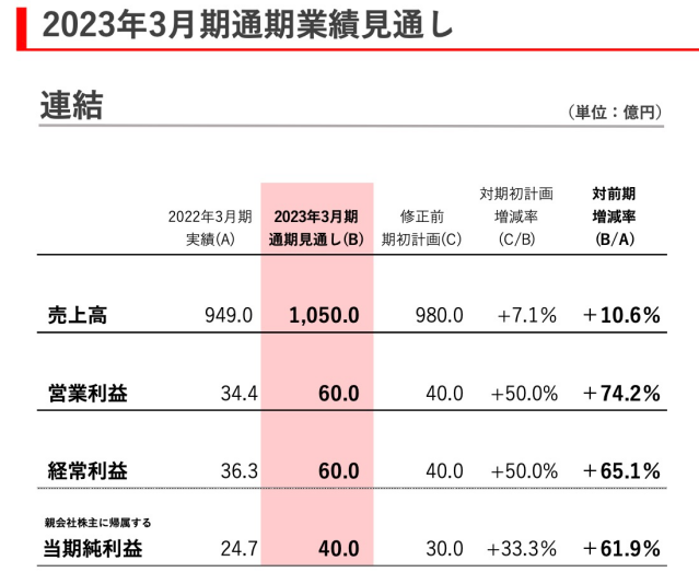 根據(jù)圓谷對于今后業(yè)績的預(yù)期可以得知,其預(yù)計(jì)在2023年3月時(shí)實(shí)現(xiàn)以下四項(xiàng)指標(biāo)的達(dá)成:銷售額達(dá)到1050億日元(折合人民幣約52.8億元)、同比增長7.1%;歸屬于母公司股東的季度凈利潤達(dá)到40億日元(折合人民幣約2.01億元),同比增長33.3%。