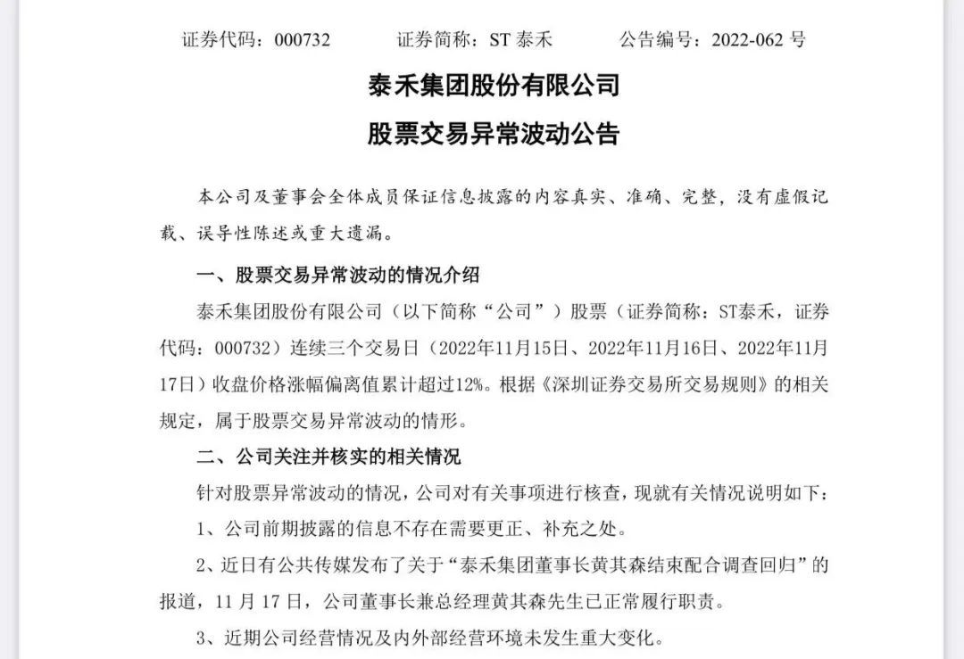 11月17日晚間,ST泰禾發(fā)布公告直面了這一消息,稱(chēng)近日有公共傳媒發(fā)布了關(guān)于“泰禾集團(tuán)董事長(zhǎng)黃其森結(jié)束配合調(diào)查回歸”的報(bào)道,11月17日,公司董事長(zhǎng)兼總經(jīng)理黃其森已正常履行職責(zé)。近期公司經(jīng)營(yíng)情況及內(nèi)外部經(jīng)營(yíng)環(huán)境未發(fā)生重大變化。