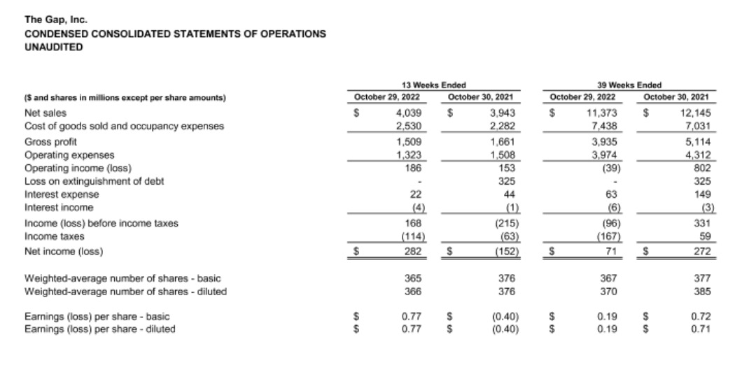 GAP在第三季度的凈收入為2.82億美元,而去年同期則虧損了1.52億美元。