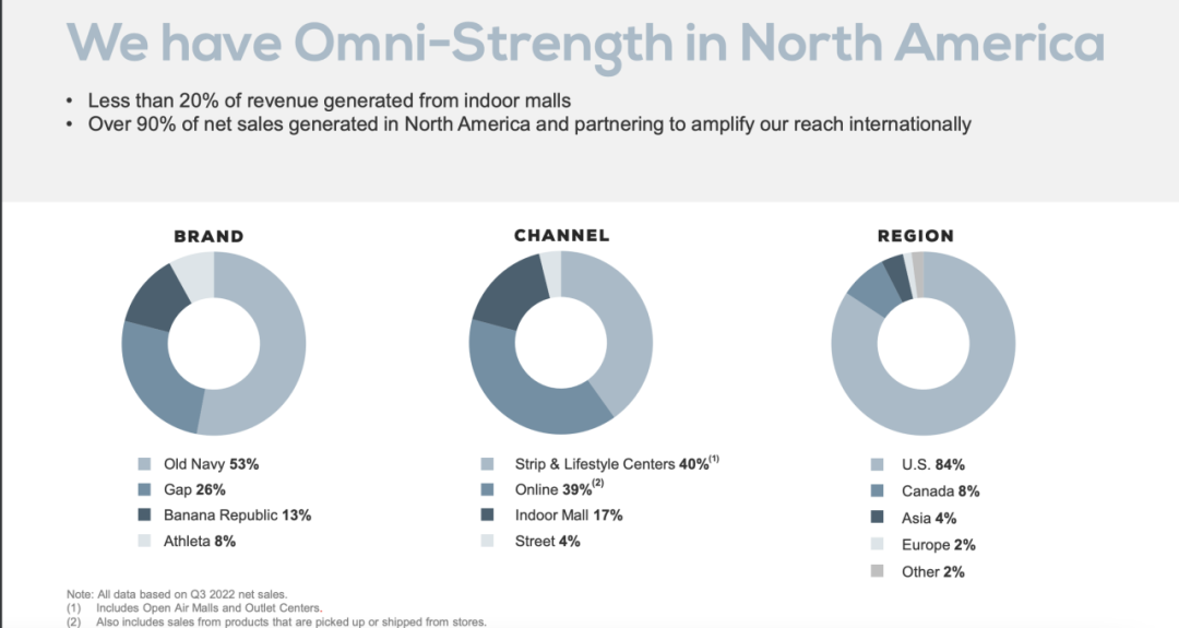值得注意的是,第三季度GAP在線上的收入份額較上一季度提高了5個(gè)百分點(diǎn),達(dá)39%。且GAP特別強(qiáng)調(diào)了其在室外購(gòu)物場(chǎng)景(比如Strip Mall,即街區(qū)型的購(gòu)物中心)渠道所占比例。