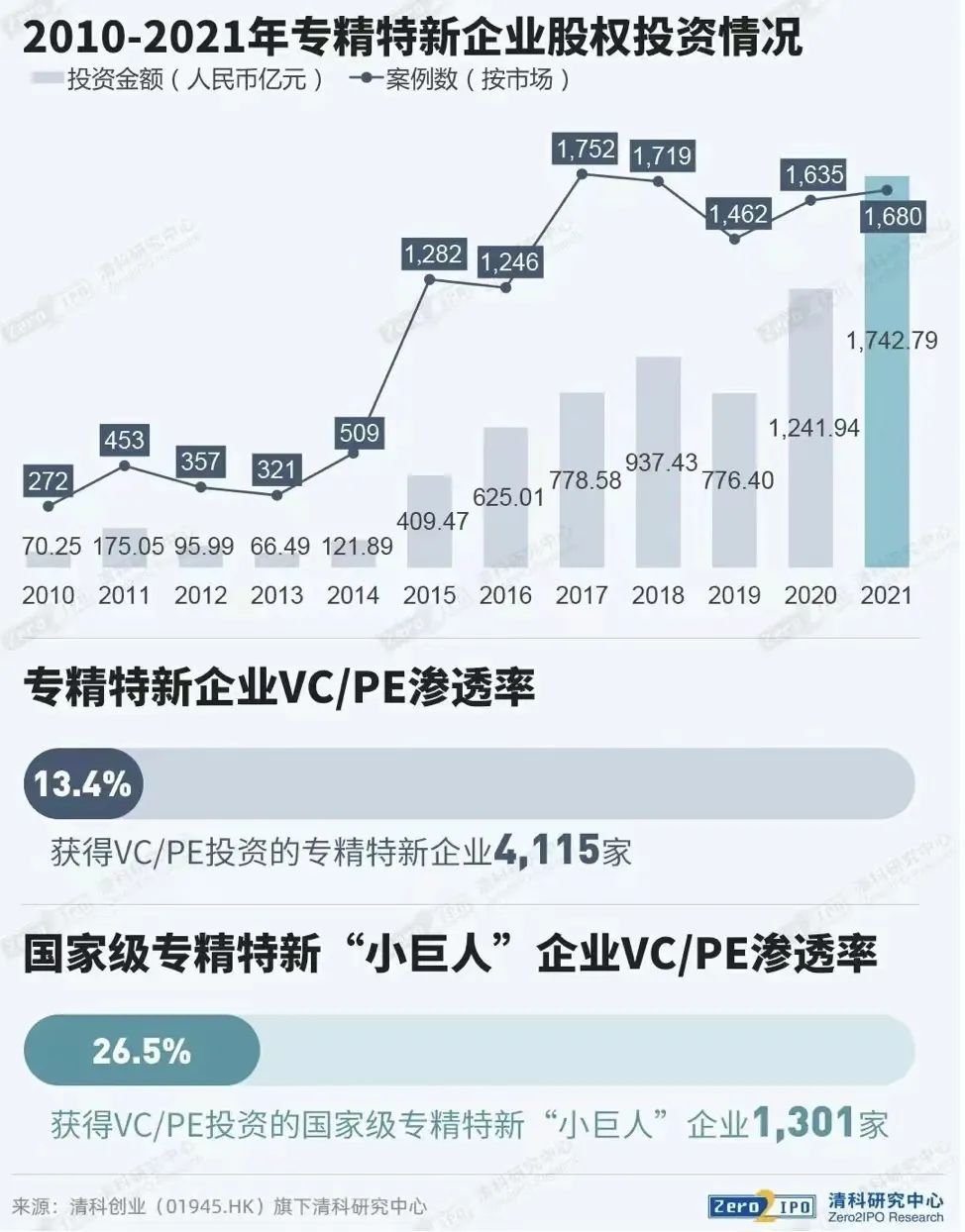 隨著投資人在政府引導(dǎo)下涌向“專精特新”企業(yè),在近十年里,我國對(duì)于“專精特新”企業(yè)的投資也在不斷攀升。根據(jù)清科研究中心數(shù)據(jù)顯示,從2019年到2021年,專精特新企業(yè)的募資事件從1462起增長至1680起;對(duì)應(yīng)募資金額也從776億元增長至1743億元左右,可以說是一個(gè)飛躍。尤其是在近一兩年,由于“專精特新”企業(yè)的高專業(yè)性、強(qiáng)創(chuàng)造力等特性,對(duì)于其的投資滲透率也高于行業(yè)平均。