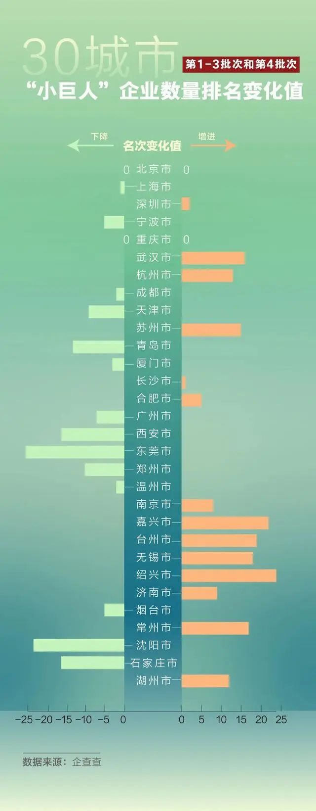 相反,也有不少城市排位下降,可見競爭之激烈。其中,在前30強(qiáng)城市中,東莞下降最多,下降25位。緊隨其后的是沈陽,下降了23。再之后還有石家莊、西安、青島、鄭州等城市,也都下滑了10多個(gè)。此消彼長,可見,在專精特新發(fā)展上,城市之間的競爭是多么的激烈。