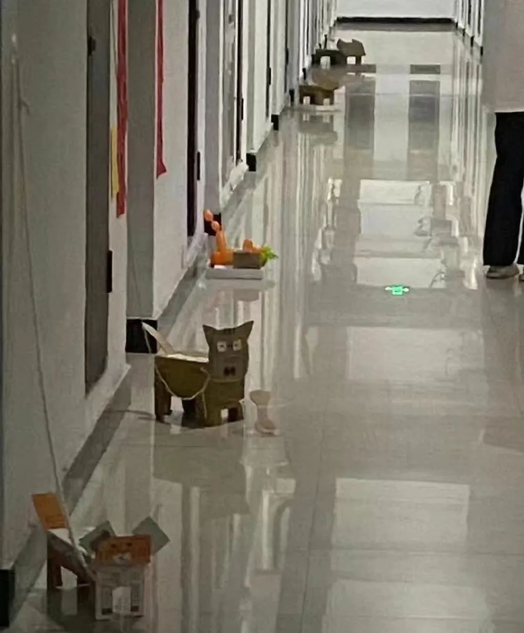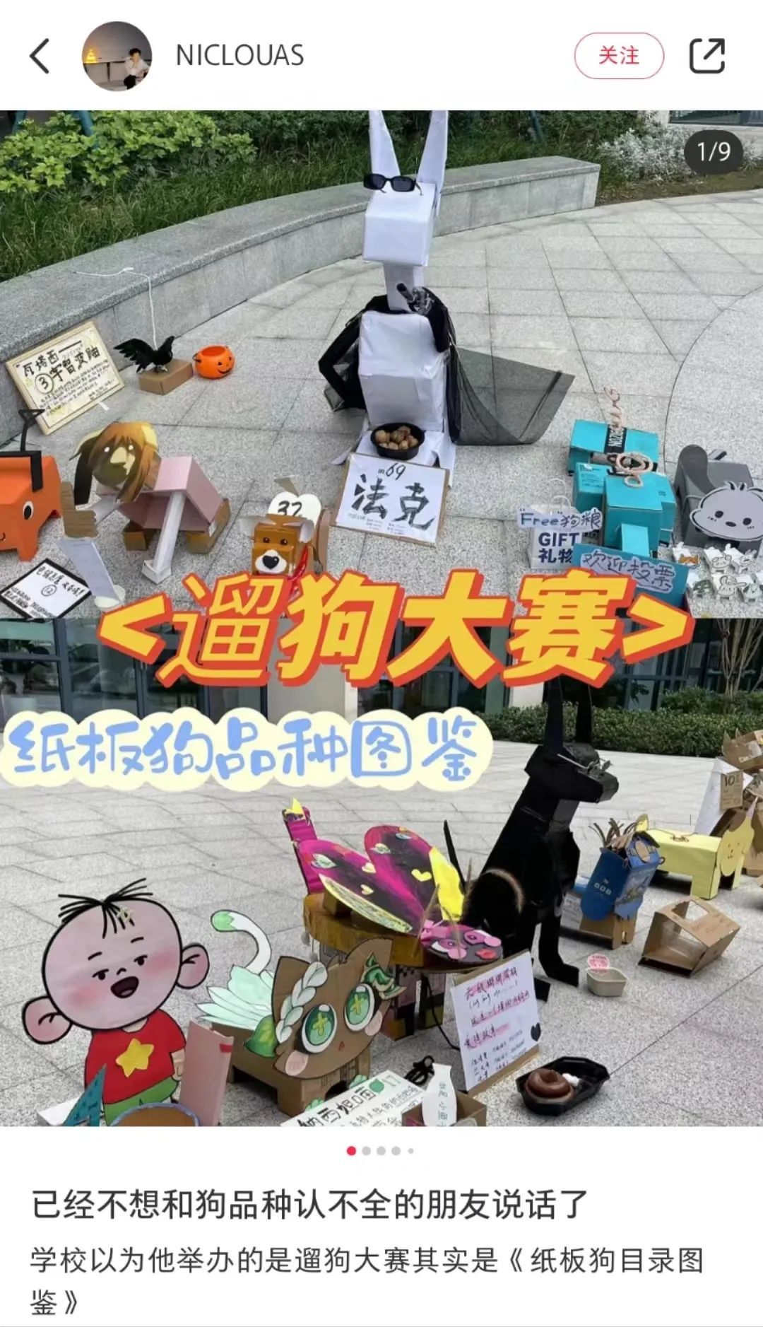 受大學(xué)生們的真情實(shí)感影響,有的高校專門設(shè)置了“停狗場(chǎng)”,還有學(xué)校官方舉辦紙箱狗展覽大會(huì),“遛紙箱狗接力跑”還成為運(yùn)動(dòng)會(huì)的項(xiàng)目之一。不少養(yǎng)狗大學(xué)生在出門時(shí)會(huì)把紙箱狗放在寢室門口“看門”,也有宿管阿姨參與進(jìn)這場(chǎng)演繹中,在寢室樓群里苦口婆心的勸說同學(xué)們“把狗狗鎖進(jìn)寢室里”。