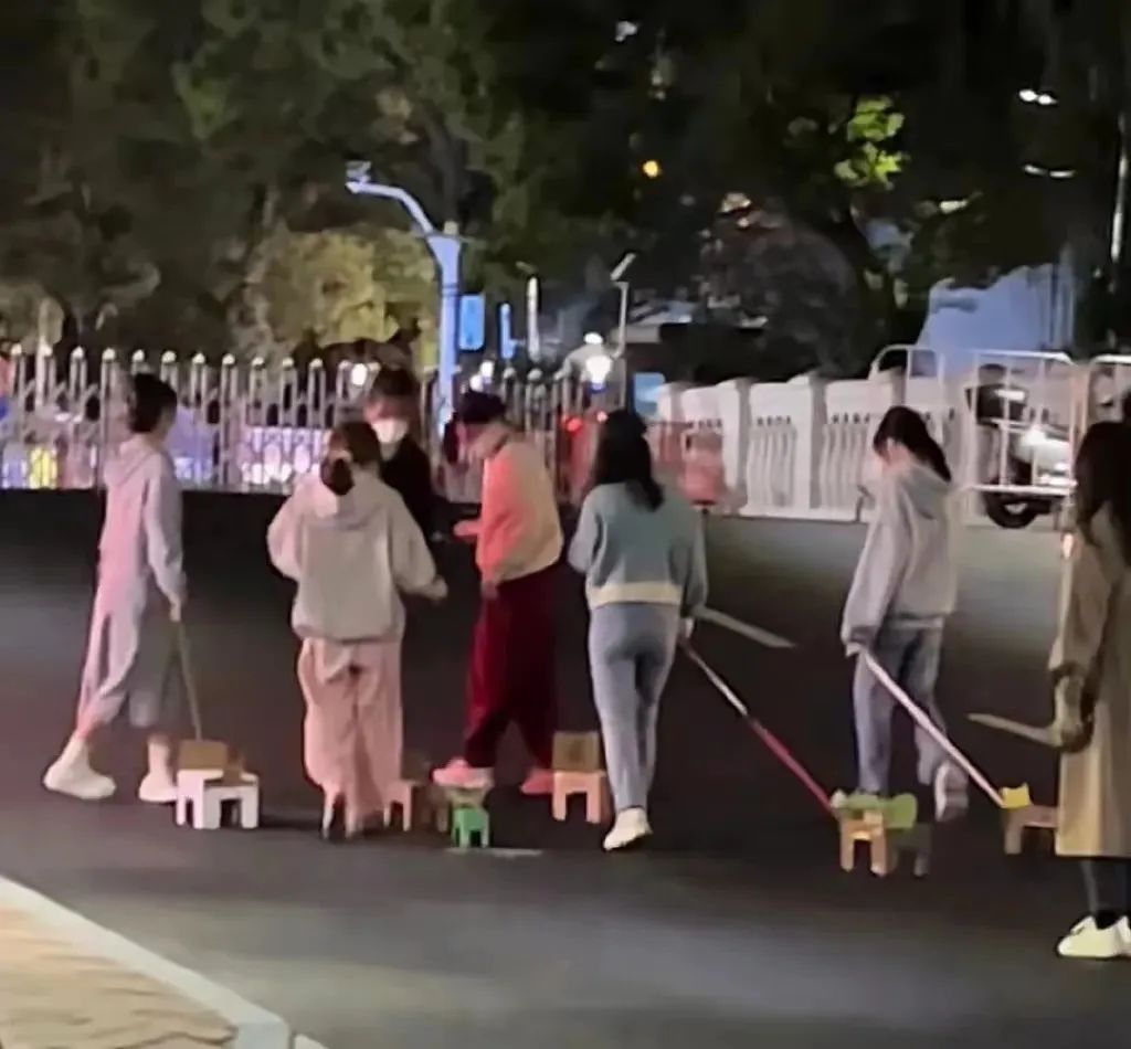 “夜爬”起源于一次校園墻上的對(duì)話,具體哪家高校已難以考證。那時(shí),一位匿名同學(xué)表示將在學(xué)校里爬行,沒想到一石激起千層浪,獲得了眾好漢的一呼百應(yīng),“爬行”開始在許多封控的高校里流傳開來,在夜晚的操場(chǎng)上,幾十個(gè)大學(xué)生或成一字形或成蜈蚣形,無聲且肆無忌憚地爬行著,將前面發(fā)瘋文學(xué)中的“(陰暗爬行)”具象化,給人以行為藝術(shù)般的視覺震撼。
