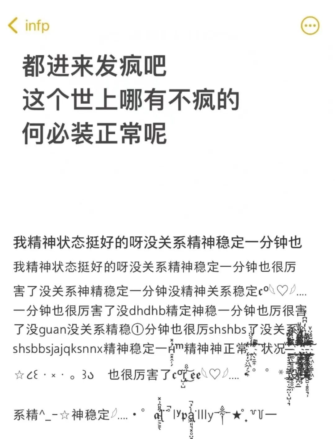 例如將某句暴躁的話進(jìn)行反復(fù)強(qiáng)調(diào),用無效信息與扎眼的感嘆號(hào)充斥整個(gè)屏幕;還有人會(huì)將自己的“發(fā)瘋行為”描述出來,例如(尖叫)(陰暗爬行)(扭動(dòng))(蠕動(dòng))(翻滾)......另一種則以單純的無厘頭取勝,例如“學(xué)了一種樂器,給大家打安塞腰鼓”“誰(shuí)往下水道扔?xùn)|西了?為什么要打擾老鼠睡覺”,或者直接開始自問自答、胡言亂語(yǔ)或者亂碼刷屏,讓人們?cè)陔y以名狀的瘋狂里感受情緒。