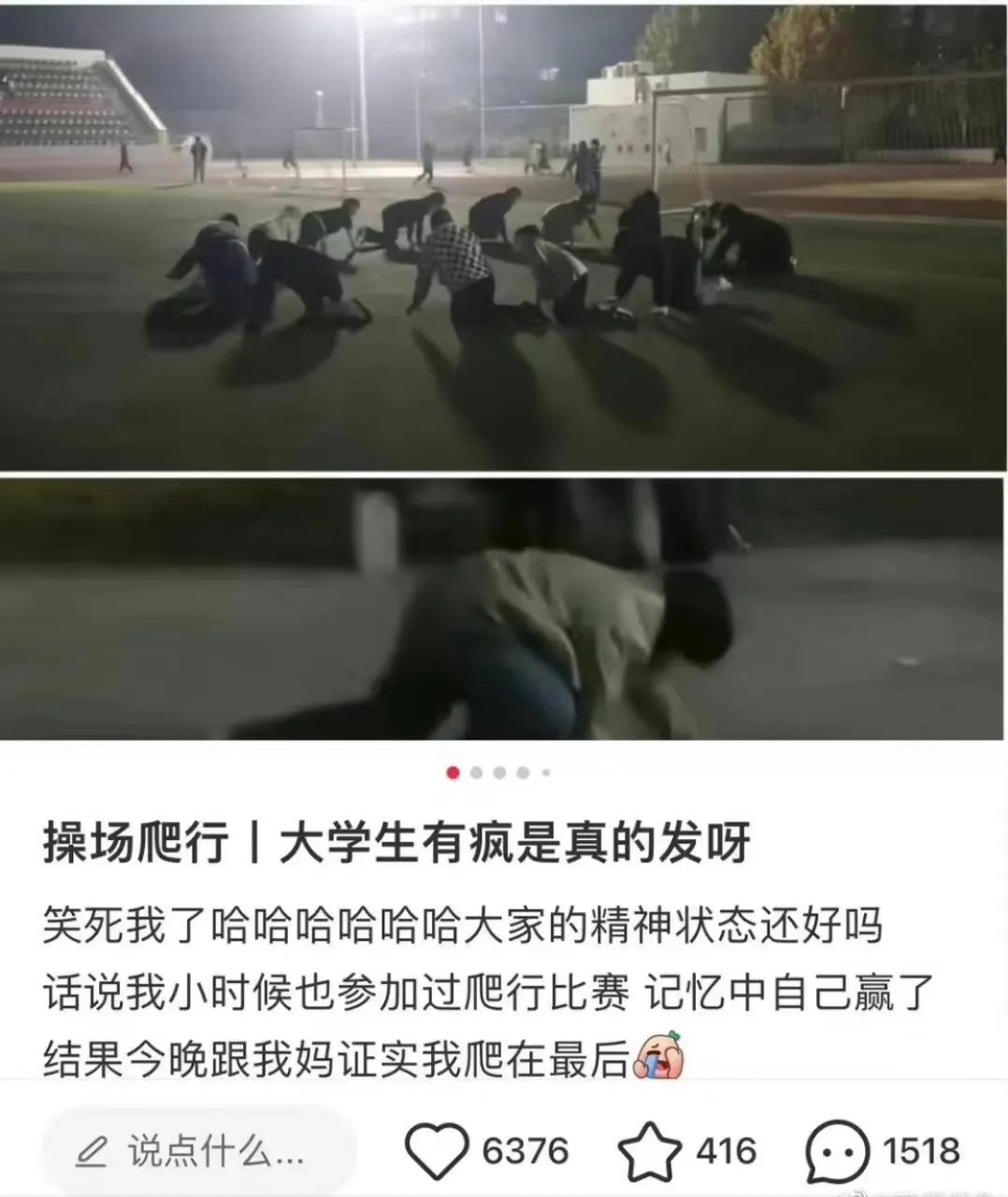 當(dāng)下,露天體育場(chǎng)是大多數(shù)高校學(xué)生的娛樂場(chǎng)所:各種操場(chǎng)音樂節(jié)、草地活動(dòng)已經(jīng)屢見不鮮,最近更是發(fā)展出了越來越多元的活動(dòng)方式,例如在操場(chǎng)上無聲蹦迪、打麻將、擺攤做美甲,但自從“夜爬”橫空出世,一切操場(chǎng)活動(dòng)都黯然失色。