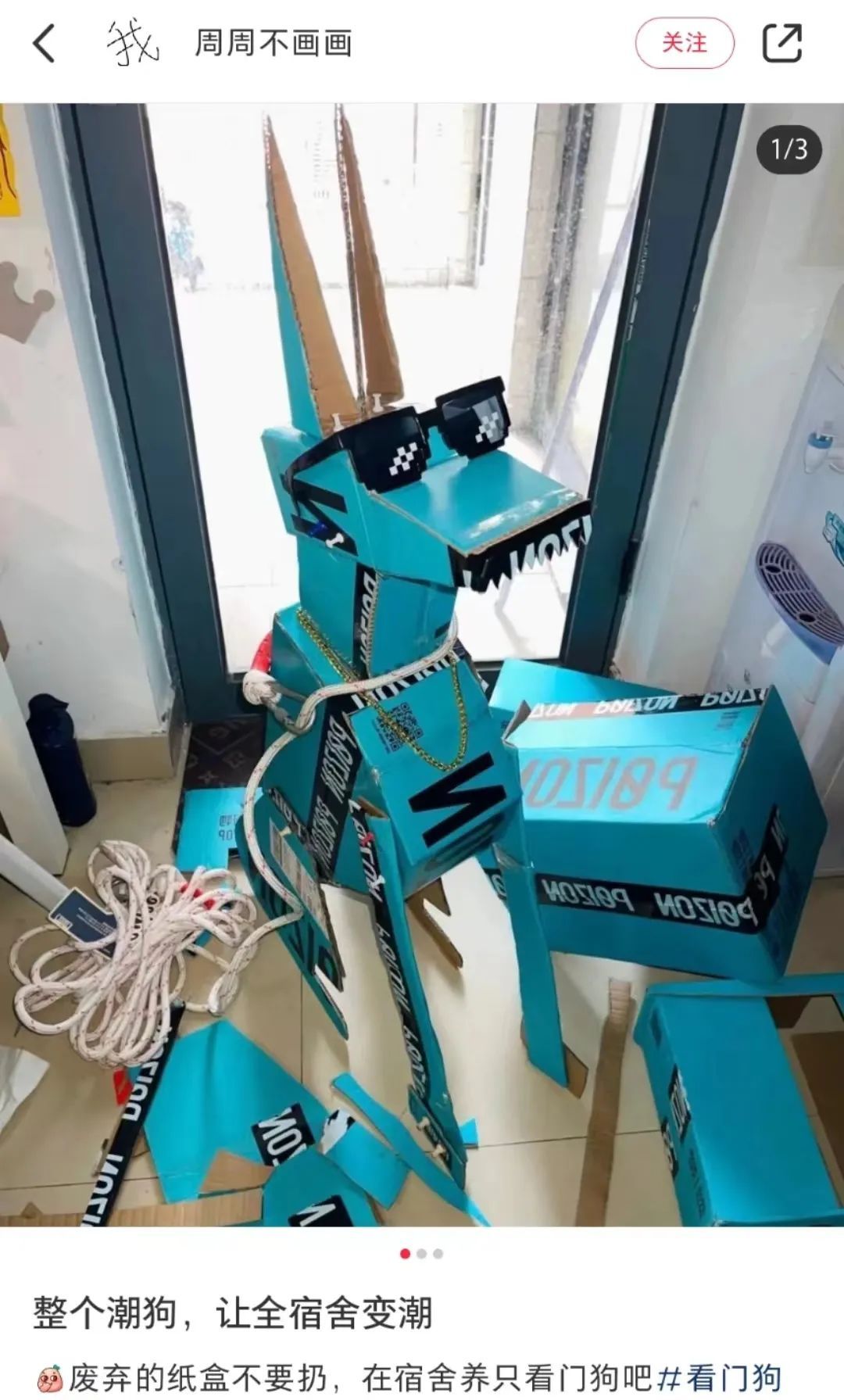 部分選手選擇走精品路線,用各種各樣奇怪的材料制作最精美的紙箱狗,而是在外觀上尋求突破杜賓、狼狗,追求的就是一個(gè)拉風(fēng),得物紙箱、煙盒都成為他們的素材,力求以出眾的外表在寢室樓道一眾小狗里鶴立雞群。