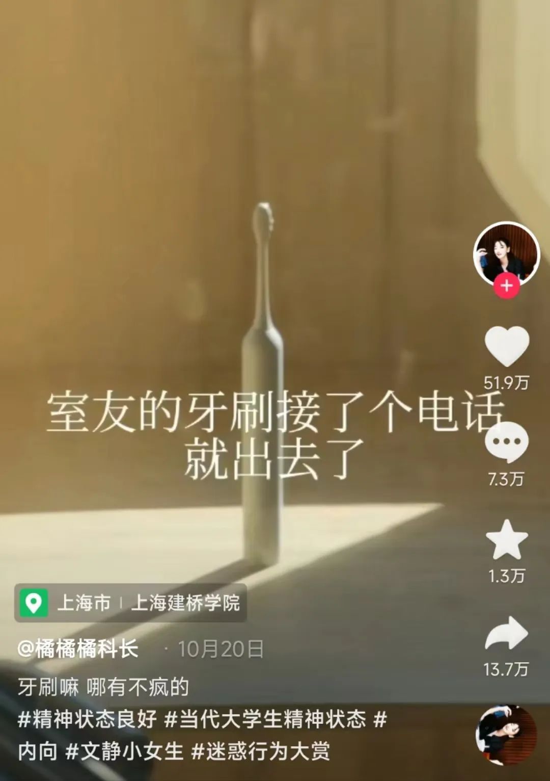 另一種表現(xiàn)是開始將事物擬人化,“室友的牙刷去陽(yáng)臺(tái)接了個(gè)電話,到現(xiàn)在還沒回來,是不是出什么事了”,三個(gè)并排的垃圾桶也被形容成“三個(gè)人的愛情”,“很難不讓人懷疑拍攝者的精神狀態(tài)”。
