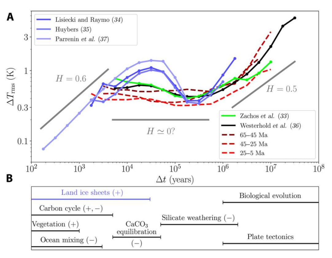于是,Arns cheidt 和 Rothman 分析了過去 6600 萬年全球平均氣溫的歷史,并考慮了不同時間尺度(比如數(shù)萬年、數(shù)十萬年)上的整個時期,來觀察這些數(shù)據(jù)是否揭示了在地質(zhì)時間尺度上控制全球溫度的穩(wěn)定現(xiàn)象的模式特征。如果沒有穩(wěn)定反饋,全球溫度的波動應(yīng)該隨著時間尺度而增長。