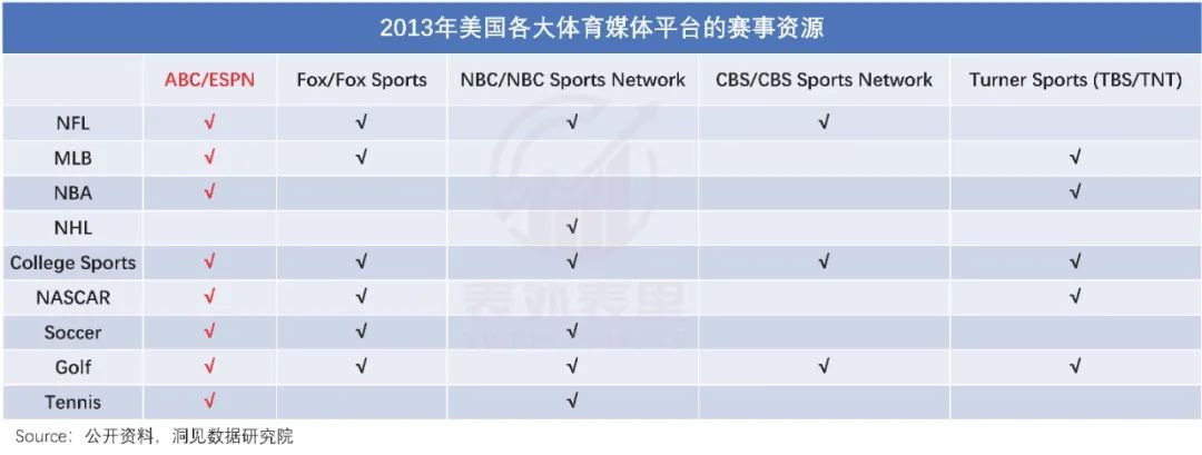 一方面,ESPN和大多數(shù)平臺(tái)一樣,發(fā)揮資本的力量不斷包攬上游內(nèi)容&版權(quán)資源。如下圖,2013年美國(guó)各大體育媒體平臺(tái)的賽事資源,ESPN是最全的。