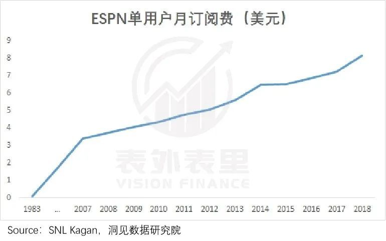數(shù)據(jù)顯示,1983-2018年,ESPN針對(duì)每個(gè)用戶的收費(fèi),從每月10美分上漲到每月8.14美元,30年平均復(fù)合增速為13%,十分驚人。