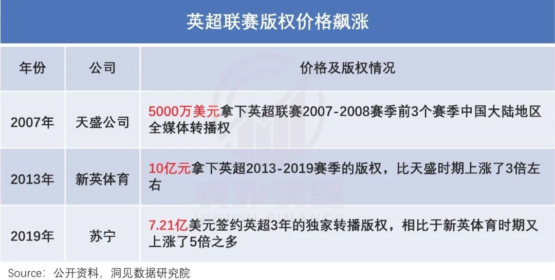 可以看到,英超聯(lián)賽版權(quán)價(jià)格連年翻倍,騰訊、PP體育、樂(lè)視都曾為買聯(lián)賽獨(dú)家版權(quán)大出血。