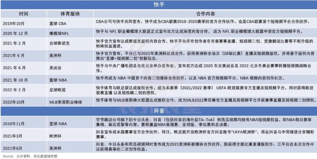 可以看到,近幾年字節(jié)一直在布局體育內(nèi)容板塊,擴(kuò)充大型體育賽事版權(quán)。當(dāng)然,快手也不遑多讓,簽下的頂級(jí)賽事合作越來(lái)越多。