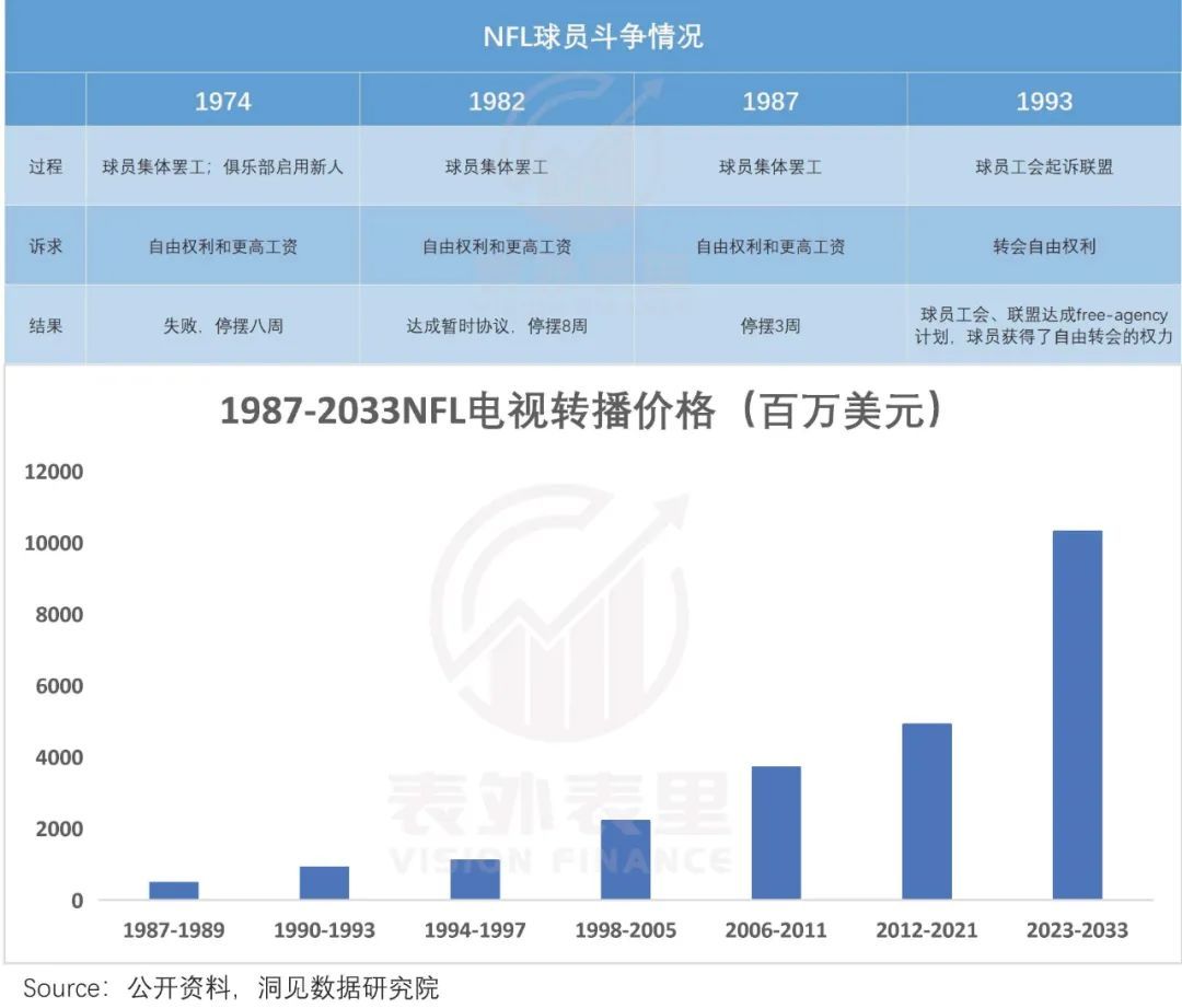 以NFL聯(lián)賽為例,球員為獲得更多自由權(quán)利和更高工資,歷史上曾多次集體罷工,最終逼迫NFL將球員收入,由1982年占聯(lián)盟收入30%,提升到1993年的60%。