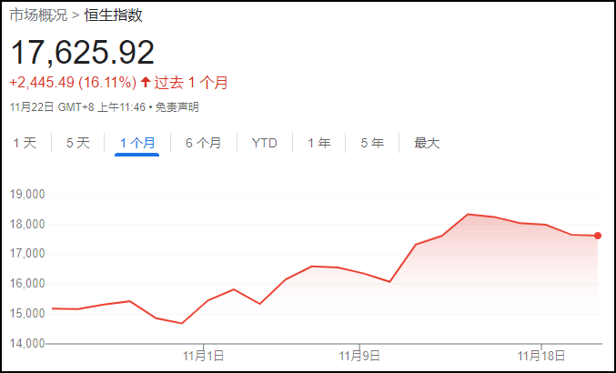 在過(guò)去一個(gè)月內(nèi),香港恒生指數(shù)上漲16.1%。而掛鉤追蹤中國(guó)各大股市的“明晟中國(guó)指數(shù)”同期上漲近20%,恒生指數(shù)和明晟中國(guó)指數(shù)均處在技術(shù)牛市中。