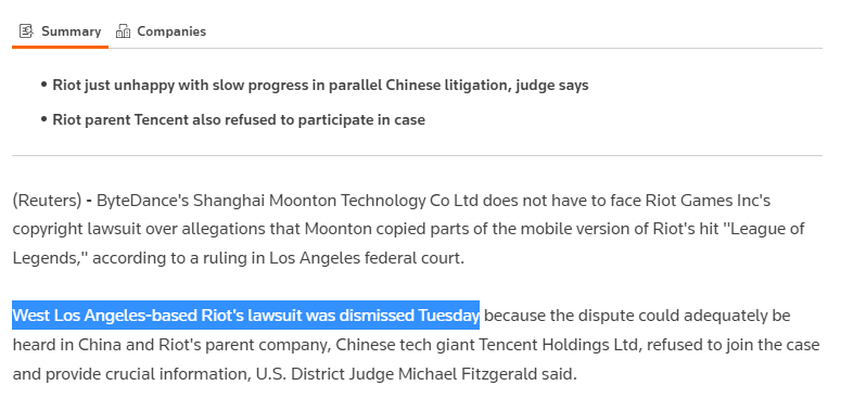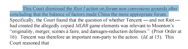 法院認為,拳頭100%被中國公司騰訊所持有,同時騰訊參與了游戲的共同開發(fā),但(不知何種原因)騰訊拒絕全面參與這一訴訟。法院的大門依舊向拳頭開放,但并不意味著法院必須就拳頭游戲在該地區(qū)提起的全部訴訟作出判決。