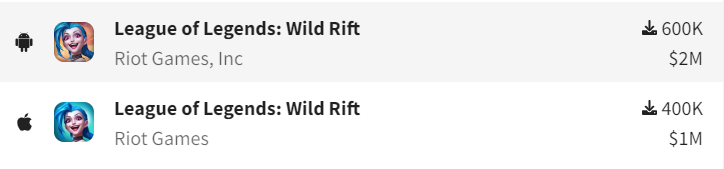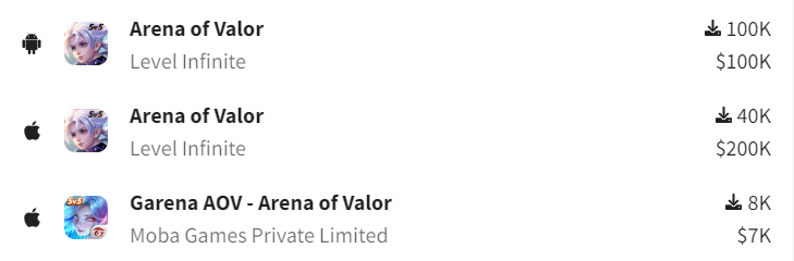 海外市場,根據(jù)Sensortower數(shù)據(jù),最近一個月《MLBB》全球收入超過1500萬美金;《LOL:WR》全球收入超過300萬美金;王者榮耀海外版《Arena of Valor》收入超過30萬美金;