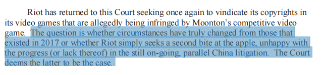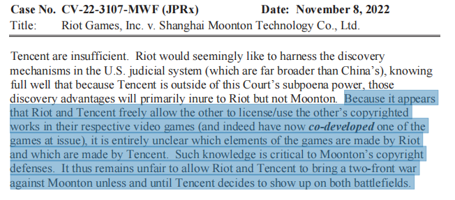 法院認為,拳頭和騰訊似乎自由地允許對方在各自的游戲中使用對方的版權(quán)作品,所以無法完全明確這些游戲(《LOL:WR》和《王者榮耀》)的哪些元素是Riot制作的,哪些是騰訊制作的,這一點對于被告沐瞳很關(guān)鍵。因此允許拳頭和騰訊對沐瞳發(fā)起雙線訴訟是不公平的。