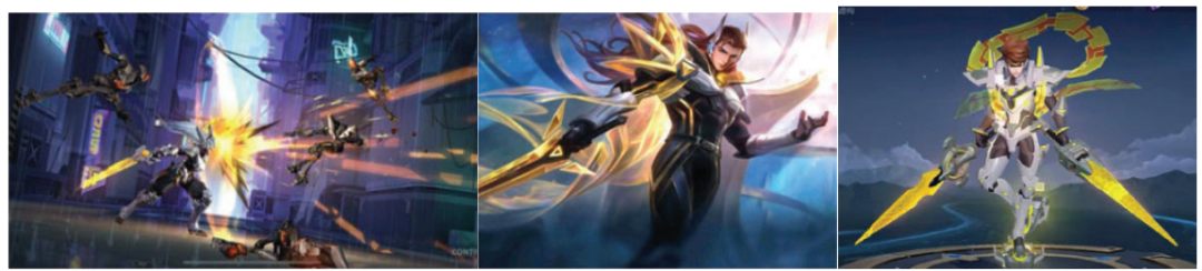 以法院提供了的一張圖為例,左側(cè)來自《英雄聯(lián)盟》/《LOL:WR》,中間來自《MLBB》,右側(cè)來自《王者榮耀》。三張圖中都有黃藍背景和黃色的武器,根據(jù)海外玩家的討論反饋,中間其實是MLBB的M2賽事冠軍戰(zhàn)隊Bren的主題皮膚,配色源自于Bren戰(zhàn)隊的隊服顏色。