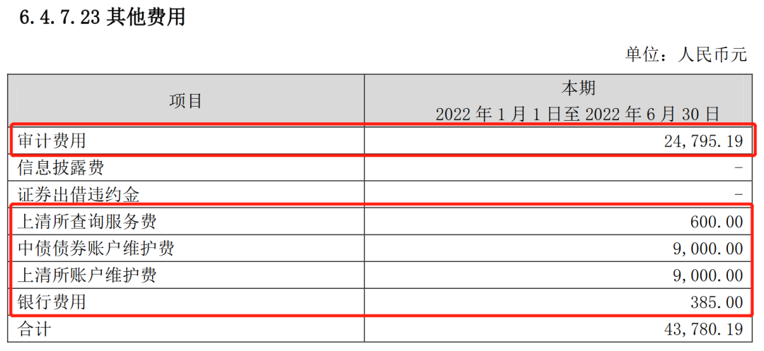 此外,在披露信息比較詳細(xì)的中報(bào)中,還可以看到,除了管理費(fèi)、銀行托管費(fèi)外,還有審計(jì)費(fèi)用、上清所查詢服務(wù)費(fèi)、中債債券賬戶維護(hù)費(fèi)等,合計(jì)4.38萬(wàn)元。這些費(fèi)用都會(huì)按比例從基金每日凈值中扣除。加之管理費(fèi),上半年費(fèi)用達(dá)4.53萬(wàn)元。