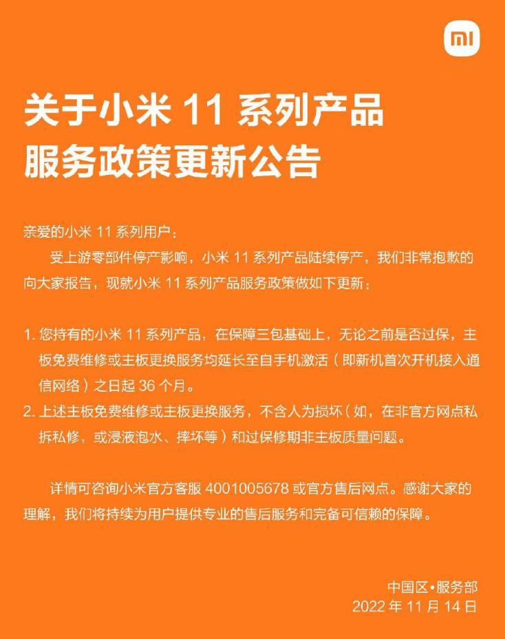 認(rèn)清現(xiàn)實(shí)的一個(gè)表現(xiàn)在于,質(zhì)量問題在逐漸被糾正,口碑被擺上日程。比如,在11月份,小米中國區(qū)服務(wù)部就更新了服務(wù)政策,宣稱小米11系列無論是否過保,將免費(fèi)提供免費(fèi)的主板更換服務(wù),時(shí)間為自手機(jī)激活之后的3年。