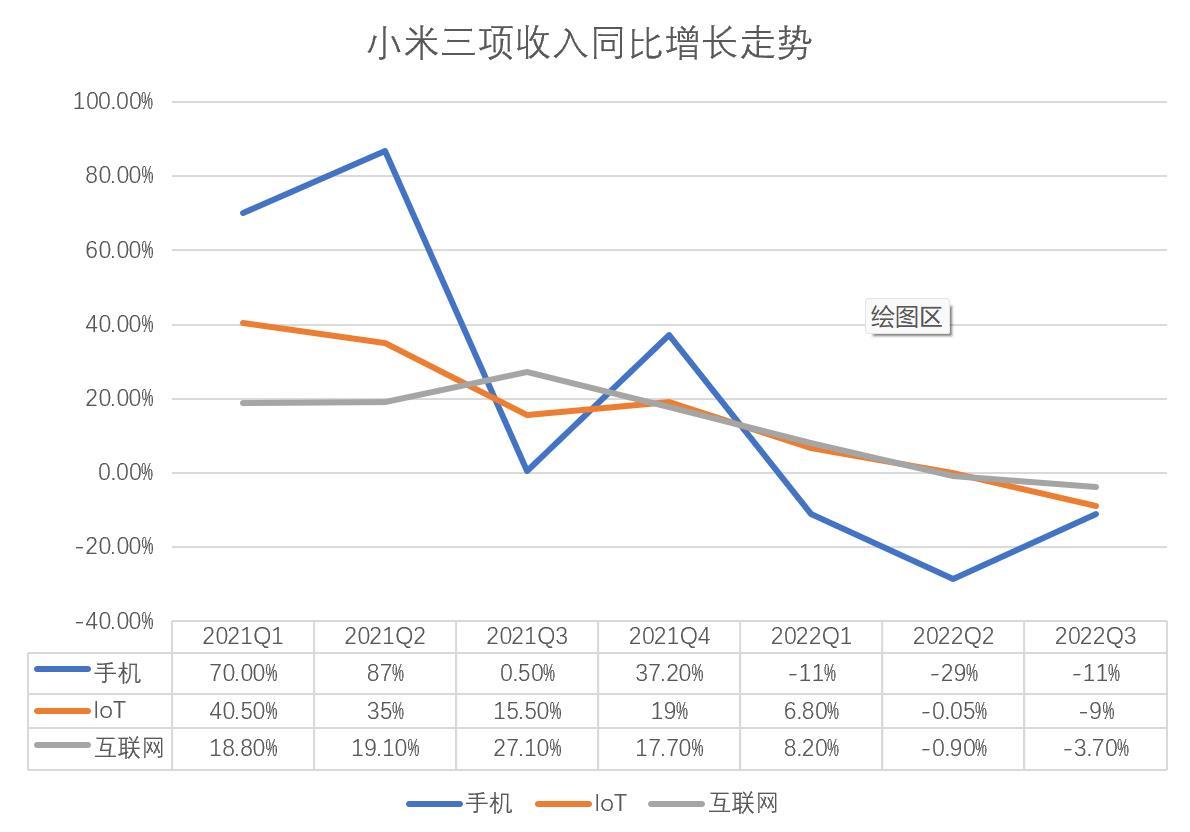 小米三項(xiàng)收入同比增長走勢(shì) 36氪制圖