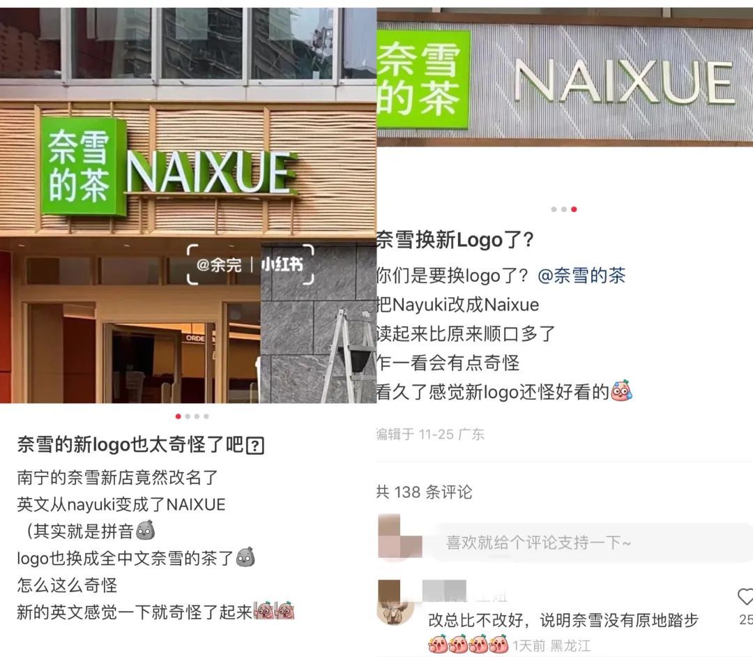 近日,有網(wǎng)友發(fā)帖稱,廣西南寧的奈雪的茶新店“竟然改名了”,不僅把logo從“奈雪の茶”換成了“奈雪的茶”,原本的英文名“NAYUKI”也變成了中文拼音“NAIXUE”。
