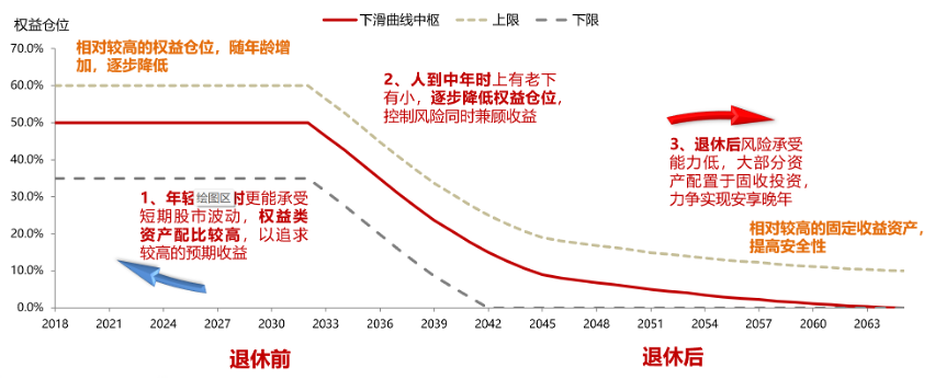 為了全面的理解養(yǎng)老業(yè)務(wù),華夏基金還通過與全球領(lǐng)先的養(yǎng)老金領(lǐng)域研究專家——富達(dá)國際、磐安資產(chǎn)管理、羅素投資、荷蘭NNIP等機(jī)構(gòu)進(jìn)行全方位合作,引入國際先進(jìn)理論和經(jīng)驗(yàn)并結(jié)合中國的經(jīng)濟(jì)增長預(yù)期、人口結(jié)構(gòu)、通貨膨脹等實(shí)際情況進(jìn)行優(yōu)化,最終形成了以下滑曲線模型為核心的投資策略,用以輔佐旗下目標(biāo)日期基金的投資決策。