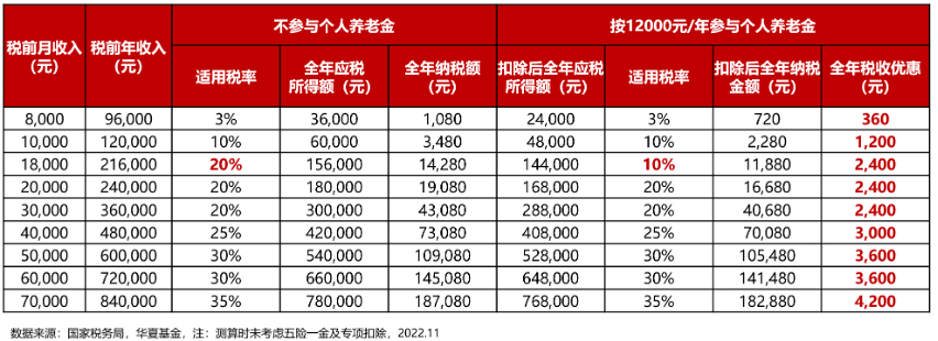 而在該政策中,稅收優(yōu)惠是最大的亮點(diǎn)之一,主要體現(xiàn)在繳費(fèi)、投資以及領(lǐng)取三個(gè)環(huán)節(jié)。其中繳費(fèi)環(huán)節(jié)中的稅收優(yōu)惠體現(xiàn)在兩方面:①稅收遞延;②納稅降檔。