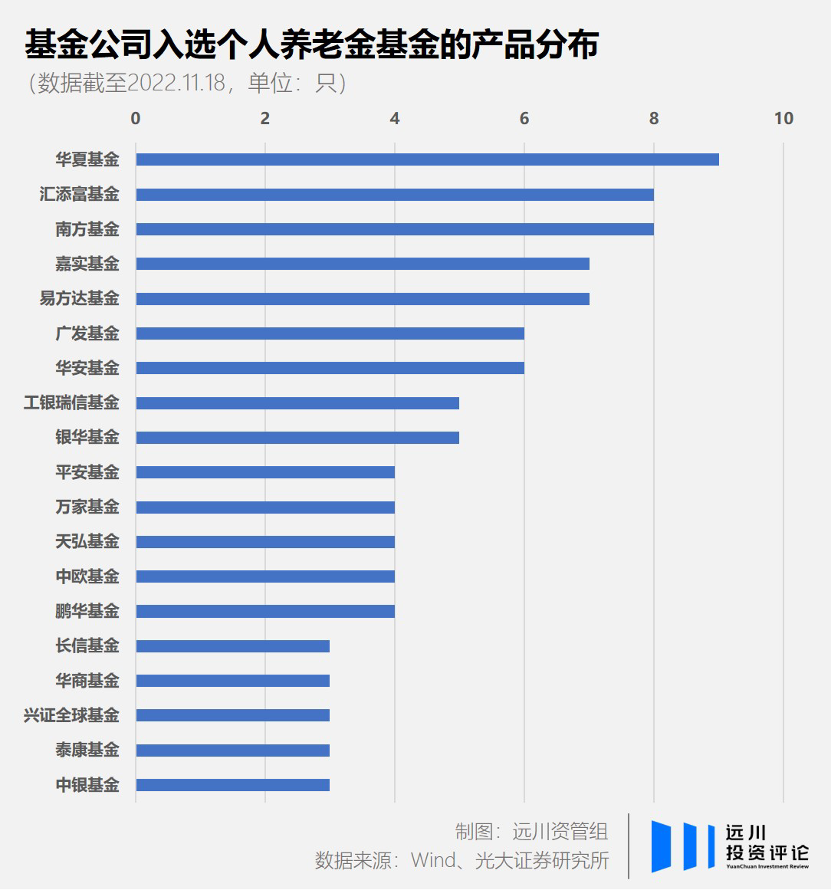 11月18日,證監(jiān)會發(fā)布首批個(gè)人養(yǎng)老金基金名錄,包括華夏基金、廣發(fā)基金等40家基金公司在內(nèi)共計(jì)129只基金產(chǎn)品。其中華夏基金共入選9只產(chǎn)品并全部增設(shè)Y份額,位列市場第一。