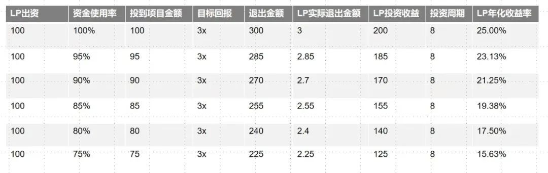 我們先來做一個簡單的模擬測算,假設(shè)LP投資某基金100萬,目標(biāo)回報3倍,持有時間8年,當(dāng)資金使用率分別在100%,95%,90%,85%,80%,75%時,對應(yīng)年化收益及回報倍數(shù)如下: