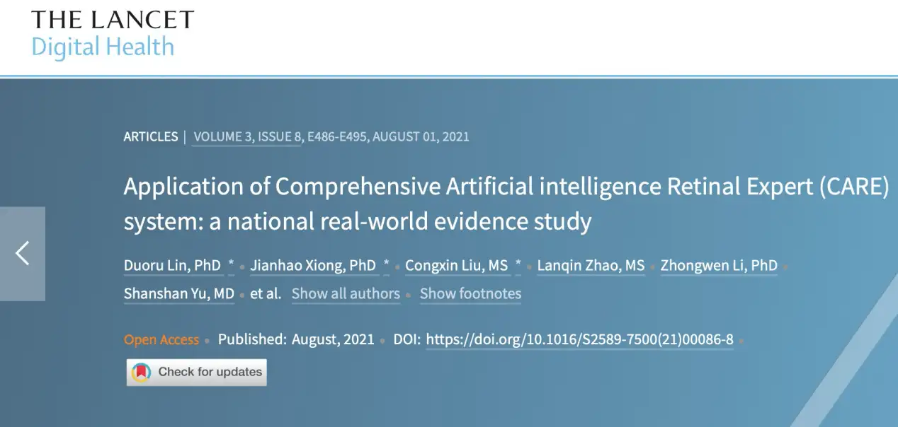視網(wǎng)膜AI輔助診斷領(lǐng)域迎來(lái)重大突破!2021年7月27日,廣州中山大學(xué)中山眼科中心林浩添教授團(tuán)隊(duì)聯(lián)合醫(yī)療人工智能領(lǐng)軍企業(yè)鷹瞳Airdoc等開(kāi)展的“AI視網(wǎng)膜多病種輔助診斷系統(tǒng)”真實(shí)世界研究,成果正式發(fā)表于國(guó)際頂級(jí)醫(yī)學(xué)期刊《柳葉刀·數(shù)字健康》(The Lancet Digital Health)雜志(SCI影響因子24.519)。