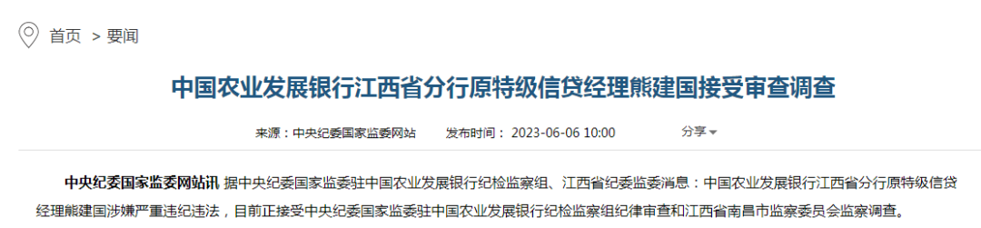 6月6日,中央紀委國家監(jiān)委網(wǎng)站發(fā)布,據(jù)中央紀委國家監(jiān)委駐中國農(nóng)業(yè)發(fā)展銀行紀檢監(jiān)察組、江西省紀委監(jiān)委消息:中國農(nóng)業(yè)發(fā)展銀行江西省分行原特級信貸經(jīng)理熊建國涉嫌嚴重違紀違法,目前正接受中央紀委國家監(jiān)委駐中國農(nóng)業(yè)發(fā)展銀行紀檢監(jiān)察組紀律審查和江西省南昌市監(jiān)察委員會監(jiān)察調(diào)查。
