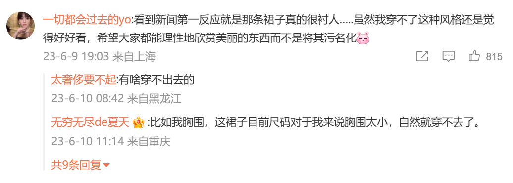 一開始有人說女主的連衣裙是價值9W的高定奢品,后來有人說這是淘寶設(shè)計師原創(chuàng)只要500多,然后又有人說500多的肯定是仿款打版……
