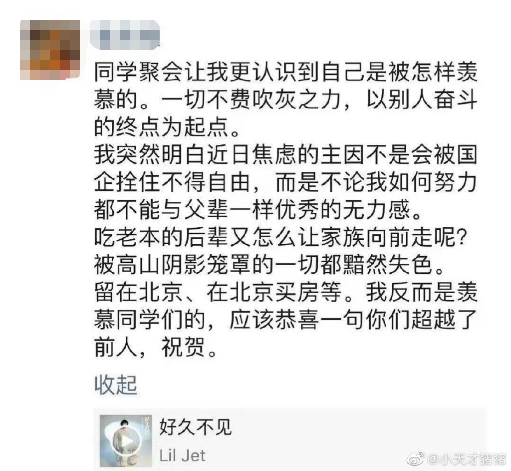 參加同學(xué)聚會,她還要發(fā)表感悟,說自己“一切不費吹灰之力,以別人奮斗的終點為起點”。