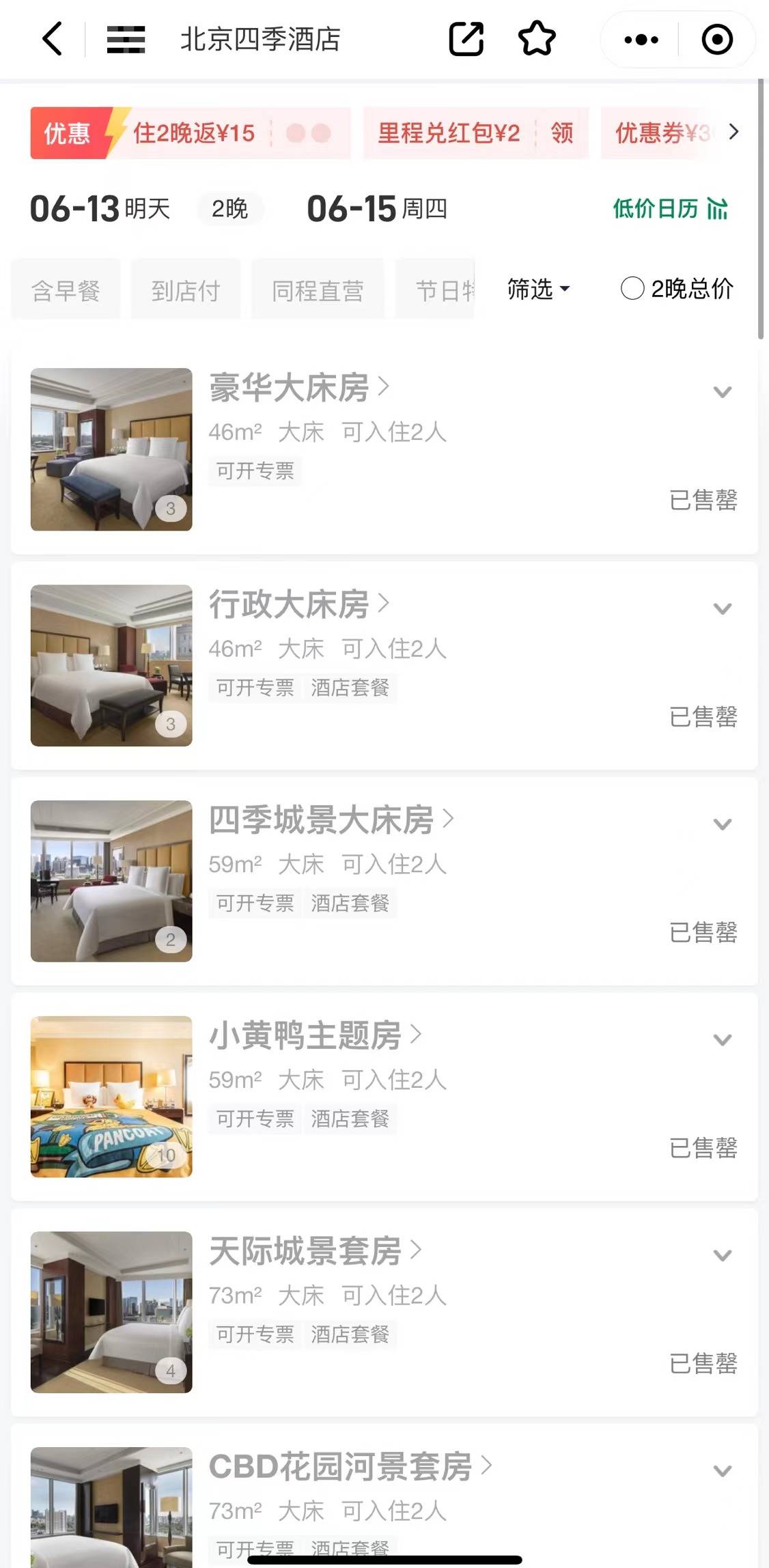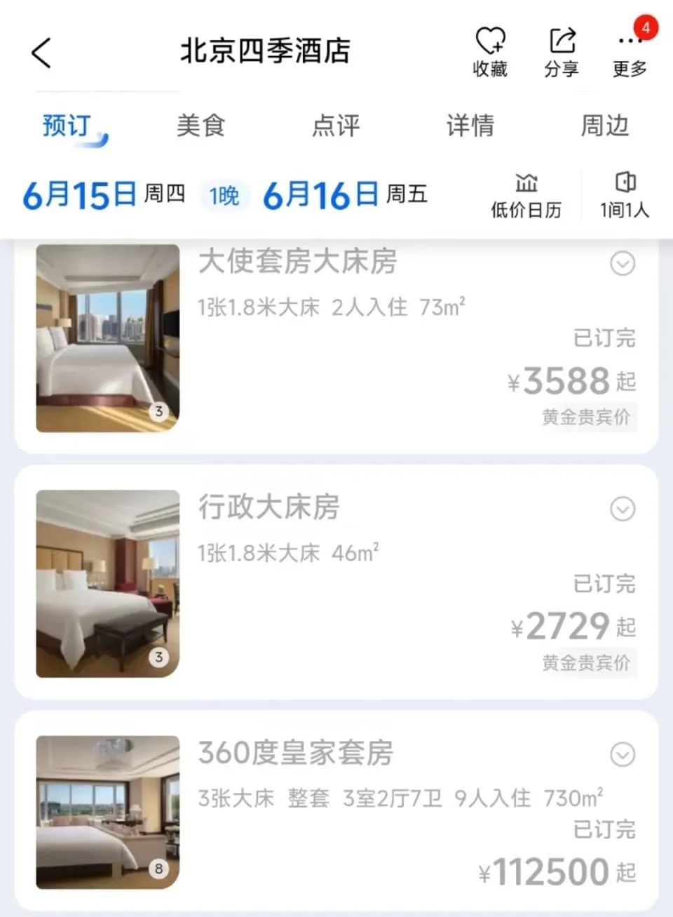 據(jù)媒體報道,6月6日,梅西等一眾阿根廷隊員下榻的北京四季酒店,在6月13日-6月15日房源僅剩小王子主題套房,但標價已漲至8738元,倘若僅預(yù)訂6月15日比賽當(dāng)天的房間,標價則顯示為12888元。