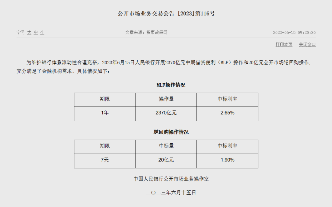 為維護(hù)銀行體系流動性合理充裕,中國人民銀行今日開展2370億元中期借貸便利(MLF)操作和20億元公開市場逆回購操作,充分滿足了金融機(jī)構(gòu)需求。中期借貸便利(MLF)中標(biāo)利率為2.65%,逆回購中標(biāo)利率為1.9%,此前分別為2.75%、1.9%。