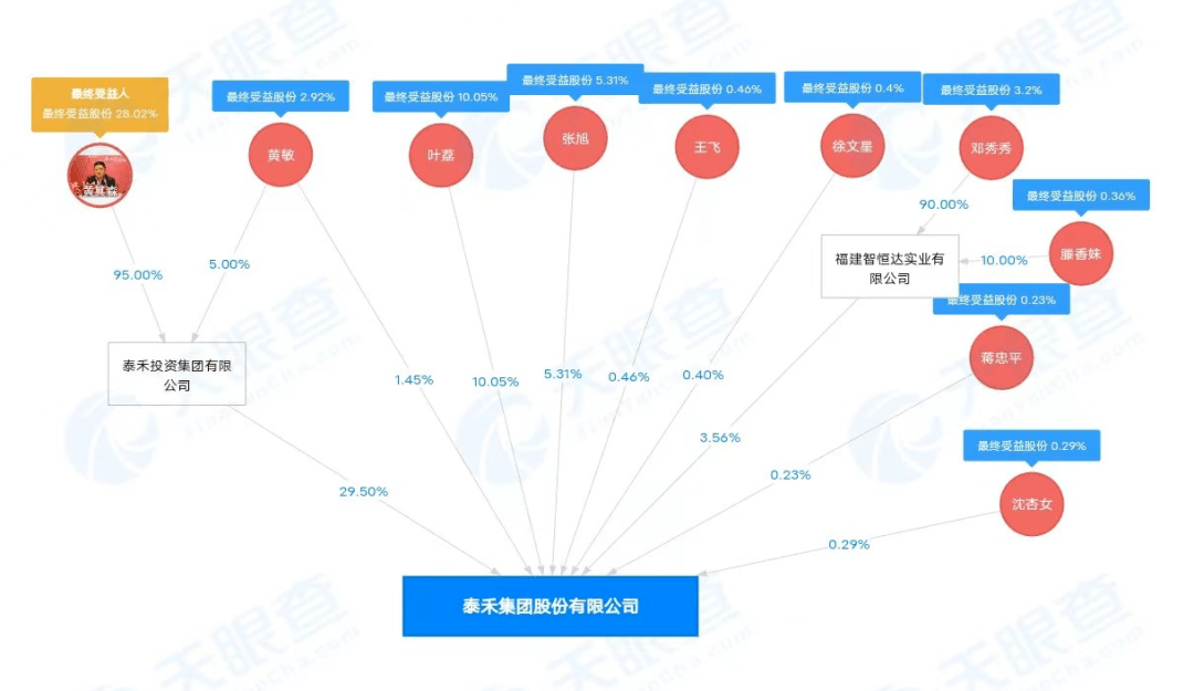 天眼查顯示,在上市公司泰禾集團中,葉荔是第二大股東,最終受益股份為10.05%,同時也是泰禾投資的一致行動人。而泰禾投資是上市公司的大股東,由黃其森持股95%。