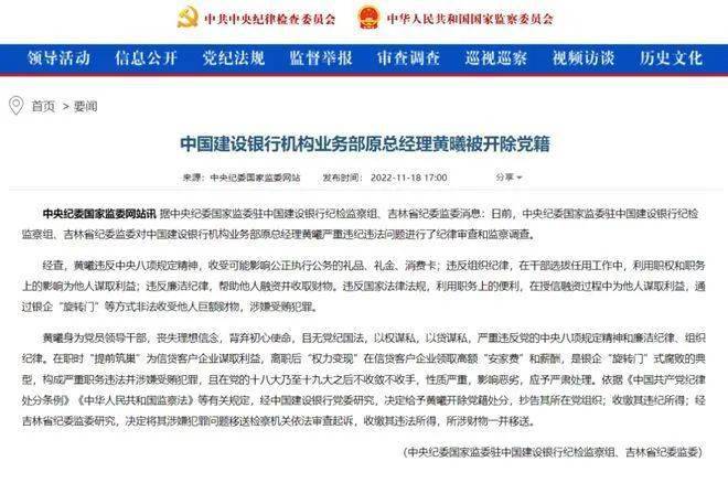 而接受調(diào)查半年后,黃曦的調(diào)查結(jié)果出爐。2022年11月18日,中央紀委國家監(jiān)委網(wǎng)站顯示,中國建設(shè)銀行機構(gòu)業(yè)務(wù)部原總經(jīng)理黃曦被開除黨籍。