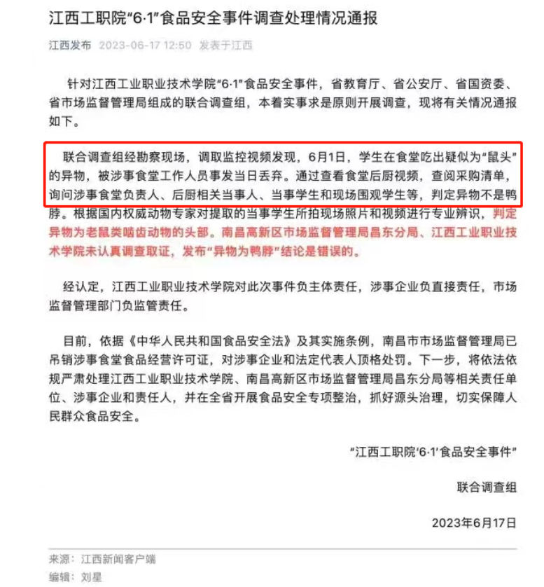 6月10日,江西省教育廳、公安廳、國資委和市場監(jiān)督管理局等部門,成立“江西工職院6.1食品安裝聯(lián)合調(diào)查組”,進行調(diào)查的新聞時,我更加的確信我的判斷:那個異物就是鼠頭,而且真相一定會大白于天下。