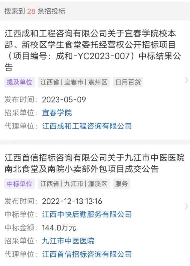 就在事發(fā)前一個月,也就是5月9日,江西中快剛剛中標(biāo)宜春學(xué)院校本部、新校區(qū)學(xué)生食堂委托經(jīng)營權(quán)。