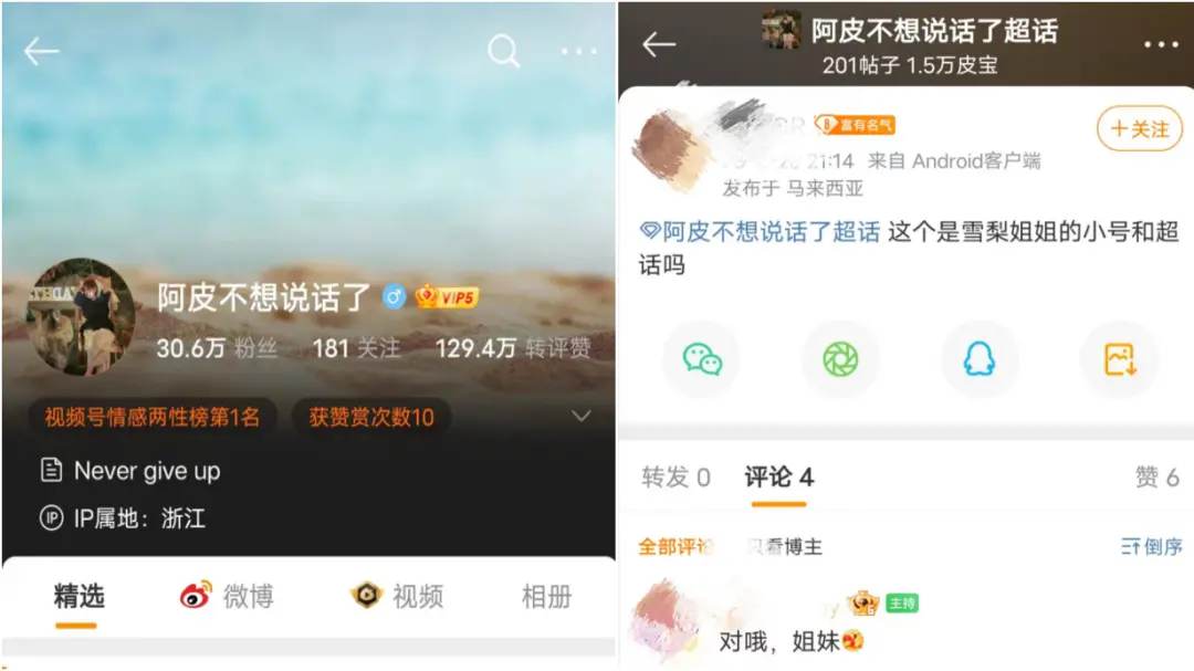 在微博上,雪梨還疑似注冊了“阿皮不想說話了”。目前,該賬號已經(jīng)發(fā)布了上千條微博,累計(jì)粉絲數(shù)超過30萬。