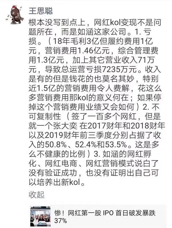 當(dāng)時(shí),張大奕所在的如涵上市破發(fā),王思聰直接在朋友圈點(diǎn)評如涵大量虧損,營銷費(fèi)用過高,網(wǎng)紅再造能力不行。
