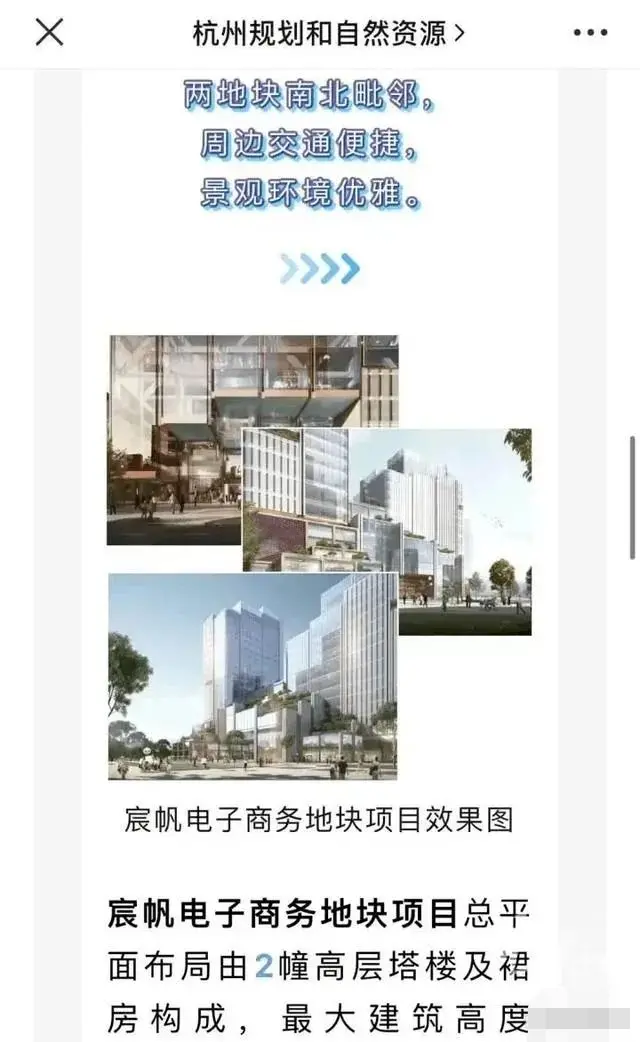 從杭州市規(guī)劃和自然資源局的公告來看,宸帆電子商務(wù)地塊項(xiàng)目總平面布局,由2 幢高層塔樓及裙房構(gòu)成,總面積約9.7萬平米。