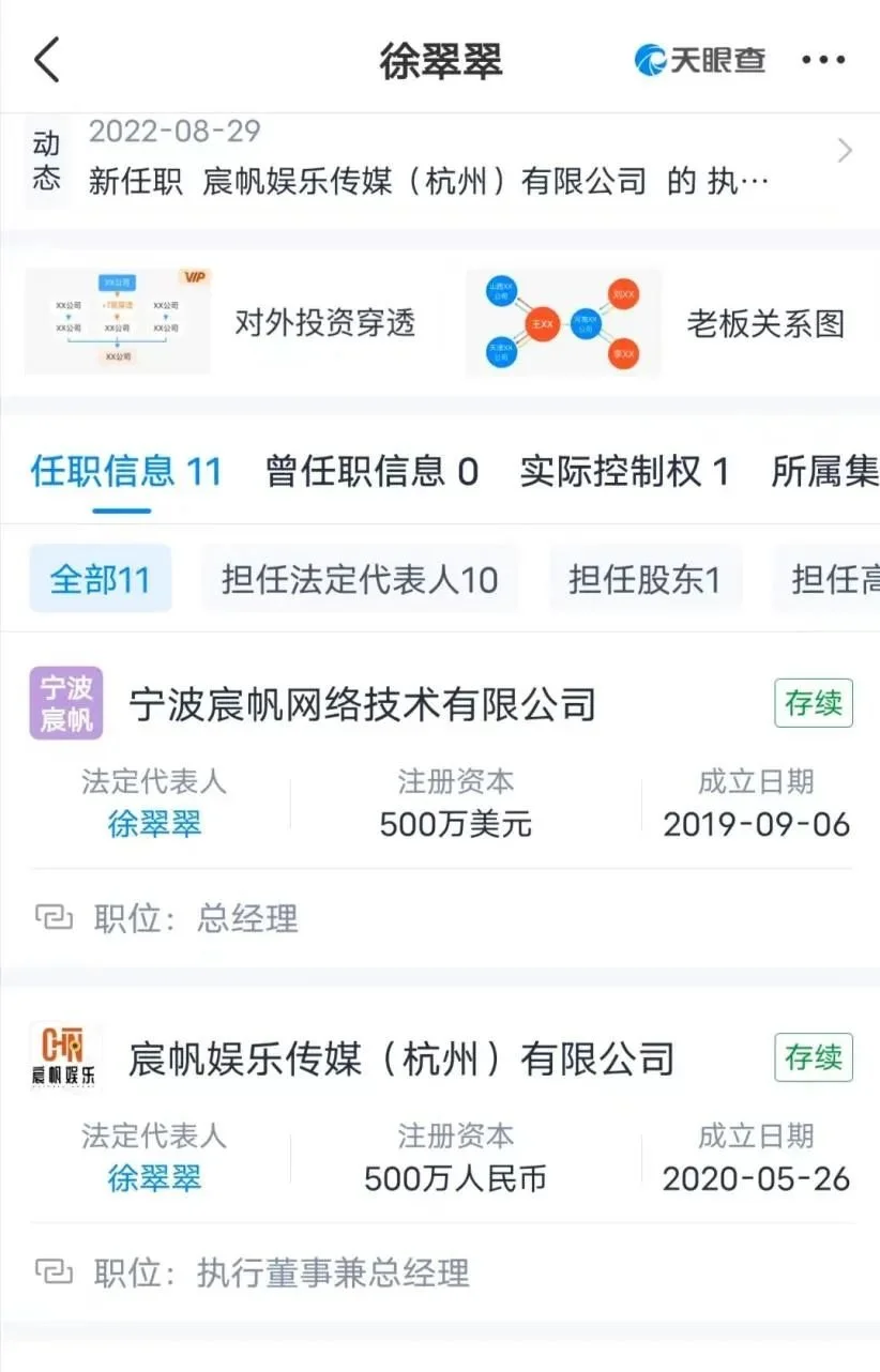 同時(shí),徐翠翠還在“宸帆娛樂傳媒(杭州)有限公司”、“寧波宸帆網(wǎng)絡(luò)技術(shù)有限公司”中,擔(dān)任法定代表人。而“宸帆系”多是與雪梨相關(guān)的企業(yè)。