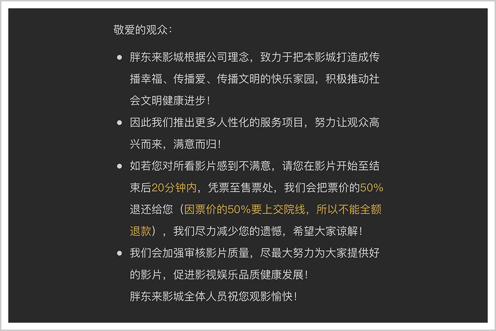 1998年,胖東來又先于電商10年推出退貨服務(wù)。找胖東來退換貨不需要小票,7日內(nèi)退差價、15天內(nèi)無理由。只要不滿意,洗發(fā)水用了一半能退,果籃吃得只剩下一個也能退。就連電影不好看,都可以在結(jié)束后20分鐘內(nèi)半價退還。