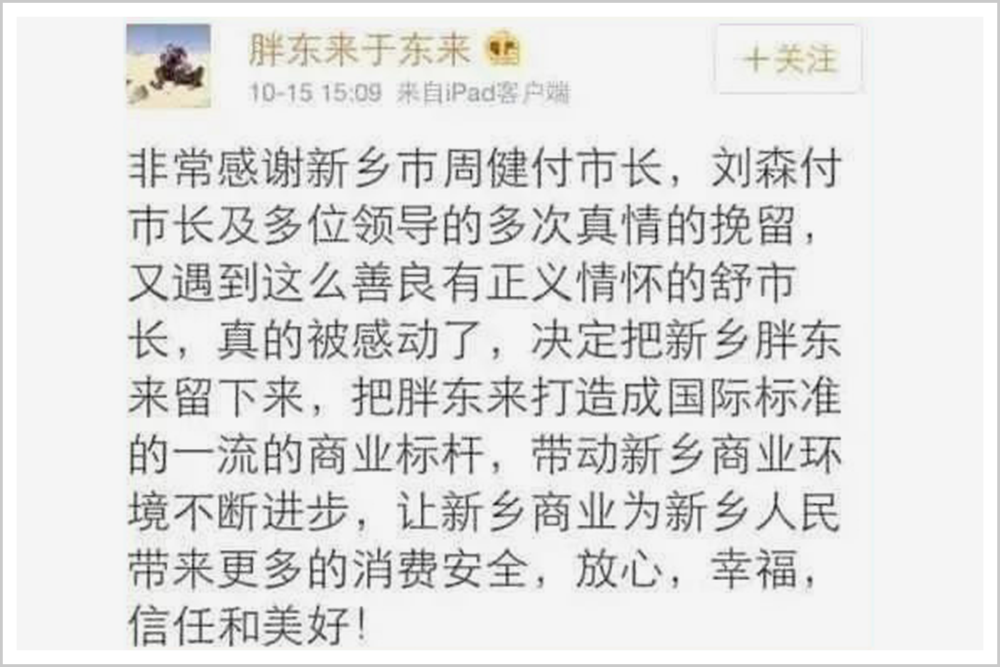 2013年4月,胖東來宣布將逐漸退出耕耘10年之久的新鄉(xiāng)市場。在新鄉(xiāng)副市長及諸多顧客的挽留下,拖延到2015年閉店。